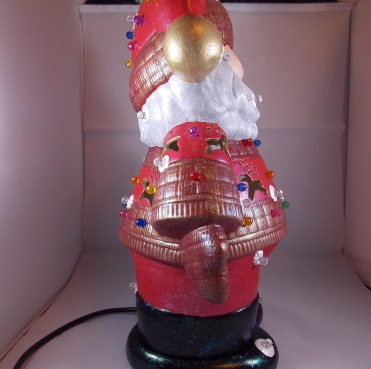 I have for sale a ceramic Christmas table lamp, which was hand painted and decorated by myself. It is a large standing Father Christmas figurine, wearing a Christmas sweater, which has small cut out reindeer on it. He has many small plastic lights decorated all over him, in a variety of different colours. He looks like he has been standing out in the snow, as he has lots of snowflakes all over him, they have small clear lights in them. The base is completely separate and contains the electrics, this part is the bottom of Santa's boots. Included in the sale is a free G9 LED light bulb. This would make a lovely addition to anyone's Christmas decorations, or perhaps given as a gift.
