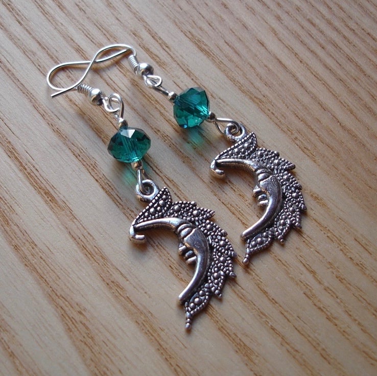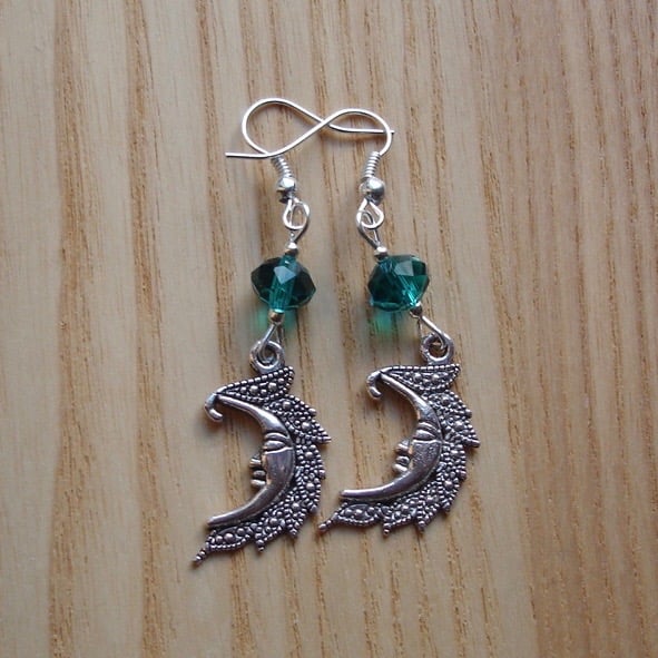 These lovely earrings feature a pair of really sweet tibetan silver man in the moon charms, great for lovers of everything kitsch. They hang on silver plated wires with glass beads above them. Light enough for regular wear, they make great daytime earrings.