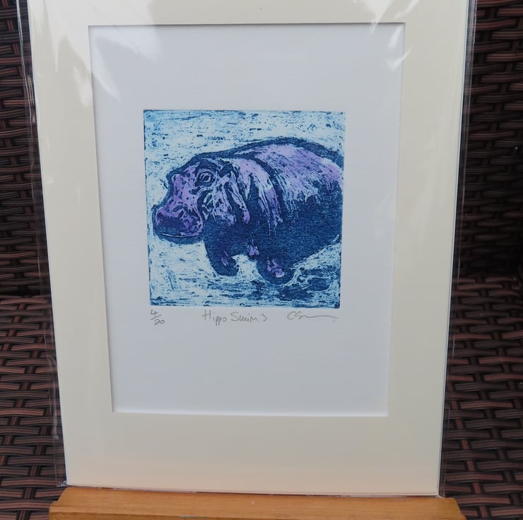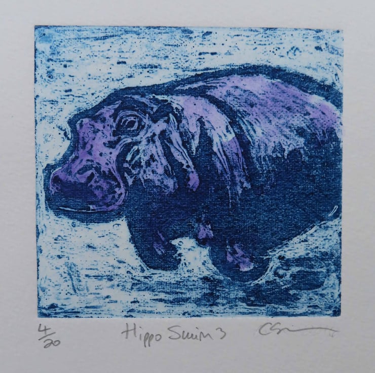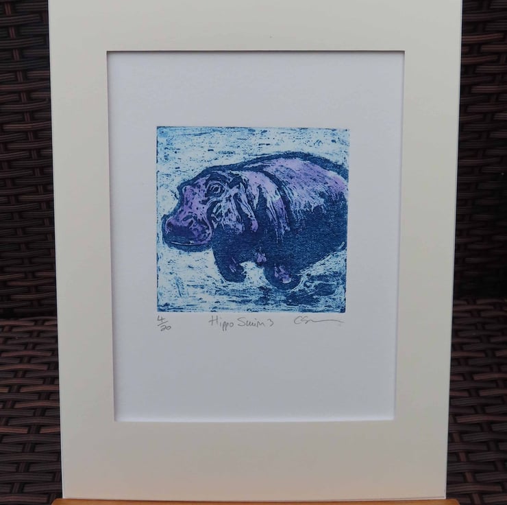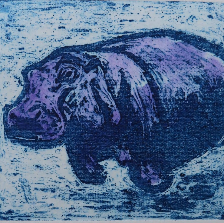 Hand printed on 300gm acid free watercolour paper in Prussian blue oil based ink with purple watercolour added..