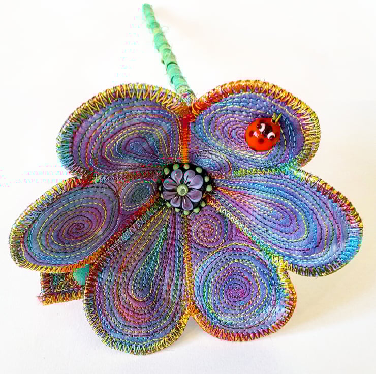 This is an individually handmade machine stitched textile flower made using hand dyed silk and cotton fabrics and lots of thread. It has a leaf coming from the side and a one of my own handmade glass lampworked beads in the middle. It also has one of my own individually handmade glass lampworked ladybirds on the flower.