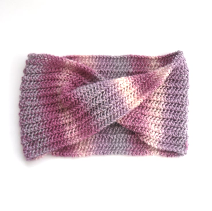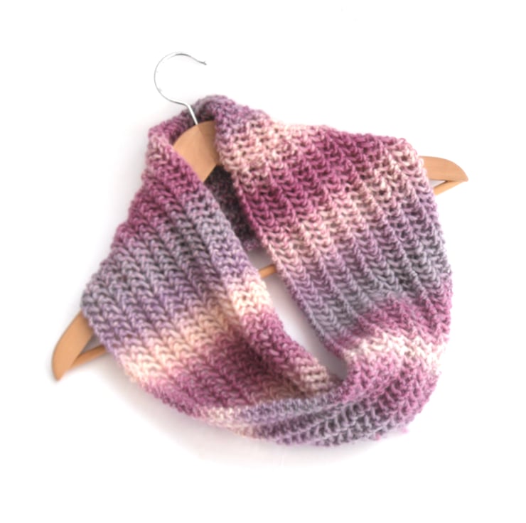 Pink Striped cowl scarf in random pinks, lilacs and cream. Hand knitted scarf in 100% wool. Pretty feminine Autumn Winter accessory . Ideal Christmas gift for the love in your life.