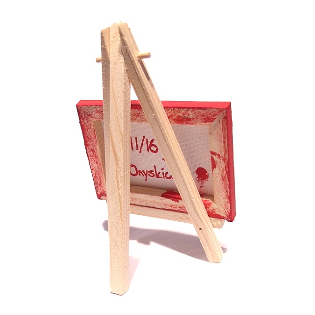 The lazy cat canvas will either come with a 12cm (4.7") wooden easel for display, or will be strung with a ribbon in a colour that matches the painting so it can be hung on a wall (as in picture 5). Just choose with easel or ribbon hanging when you buy.