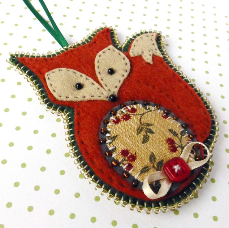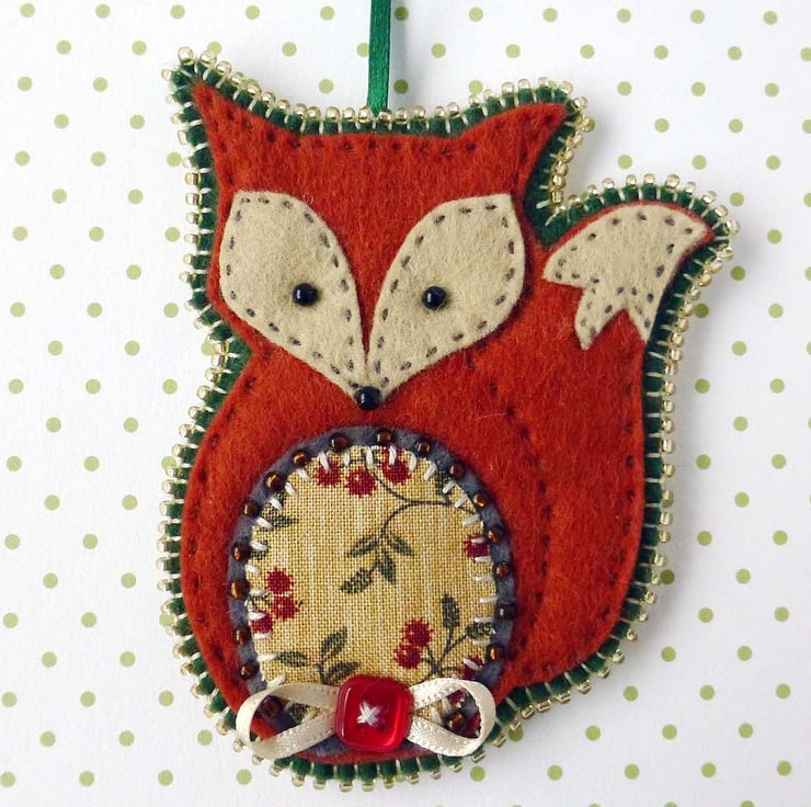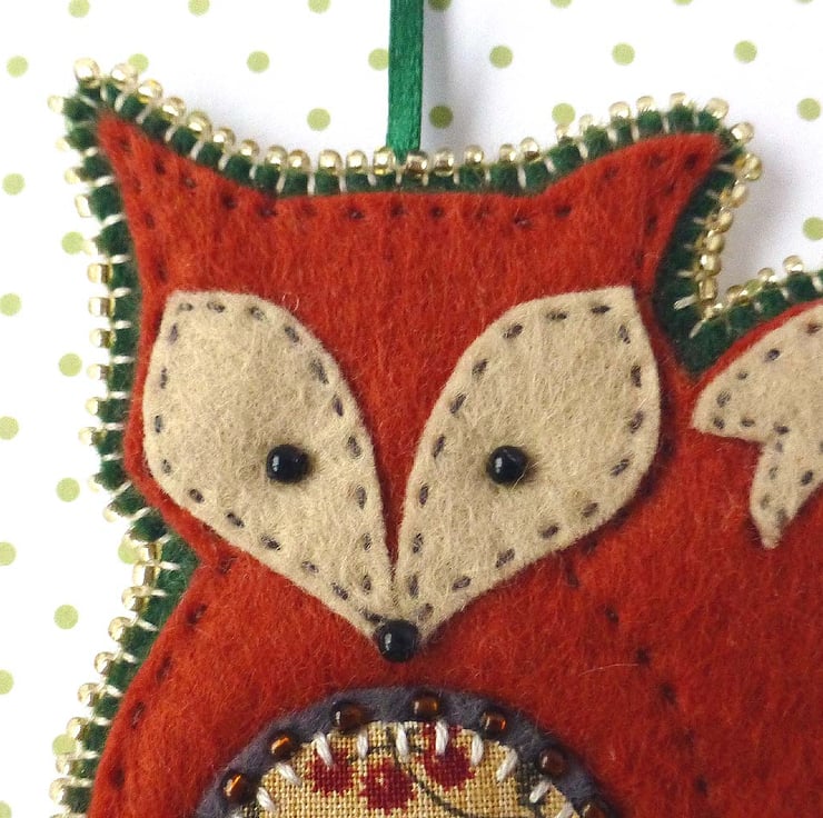 The felt fox has been appliqued onto dark green felt and features a stitched face with beaded eyes and an applique tummy in coordinating cotton print fabric. It has been finished with a little button and ribbon detail and is edged with gold beaded blanket stitch edging which catches the light beautifully. There is a ribbon hanging loop attached at the top.