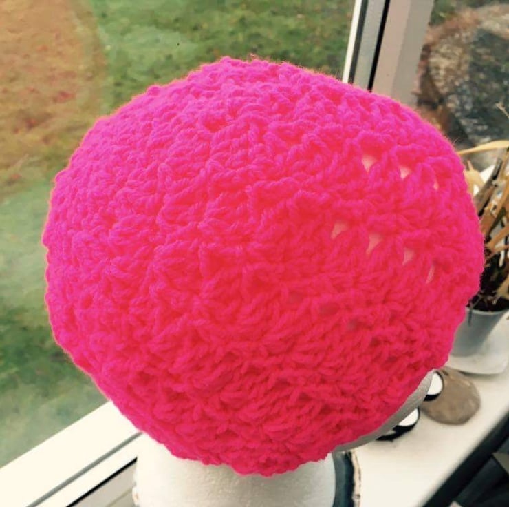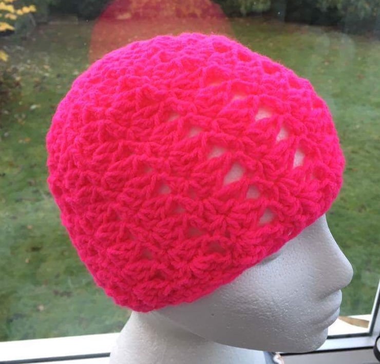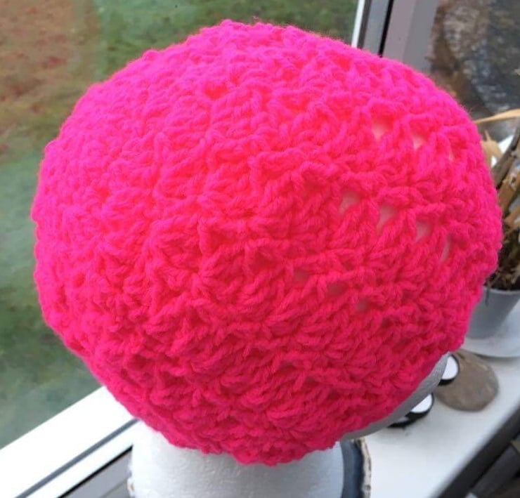 The Hot Pink 100% acrylic yarn for this crocheted hat is wonderfully soft and is perfect shade for those who love Vibrant colours and want to be noticed, maybe perfect for joggers or cyclists, although the yarn DOES NOT REFLECT LIGHT, even if fluorescent pink in colour. The crochet style give lists of aeration.