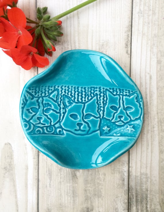 This cute little trinket dish has been hand formed. I impressed a cat design into soft clay, let it dry for a few hours then hand formed it into the desired shape. Continued the drying process sponged off the rough edges again letting it dry for another 24 hours,then fired, glazed three times and fired again