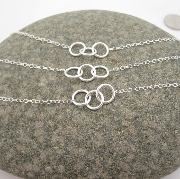 Simple little Three Interlocking silver circles necklace, a pure & simple design. 18" with 8mm circes (approx). This listing is for a set of three necklaces for a the three of you.