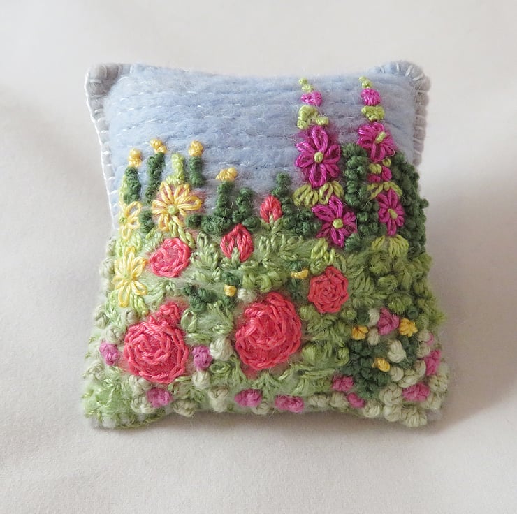 A pretty, felted and embroidered garden design decorates this pincushion.