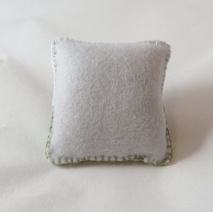 The back of the pincushion is grey eco felt. The pincushion is gently stuffed with polyester filling.