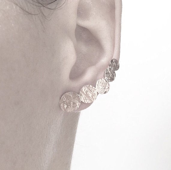 A very on trend unique earcuff. Textured circle flat earrings that crawl up the ear. Has a hammered detail to resemble a meadow.