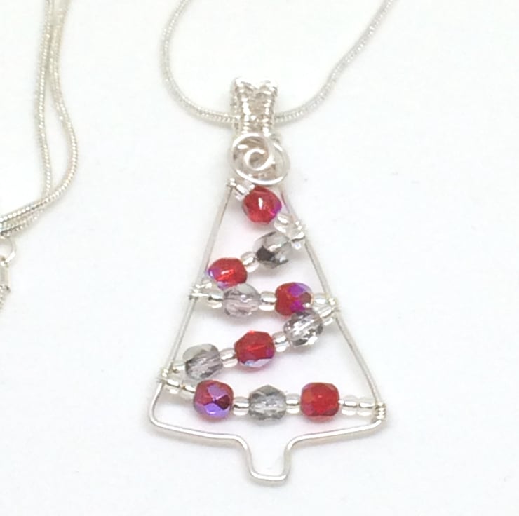 I have formed silver plated wire into a Christmas tree shape using wire weaving and wire wrapping techniques. Fire polished Czech crystal beads in silver and red and silver lined seed beads are wrapped around the tree shape with fine silver plated wire. A silver plated snake chain is included.