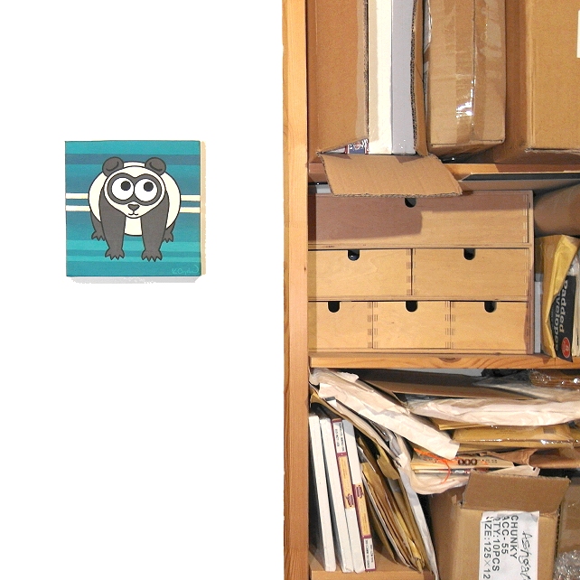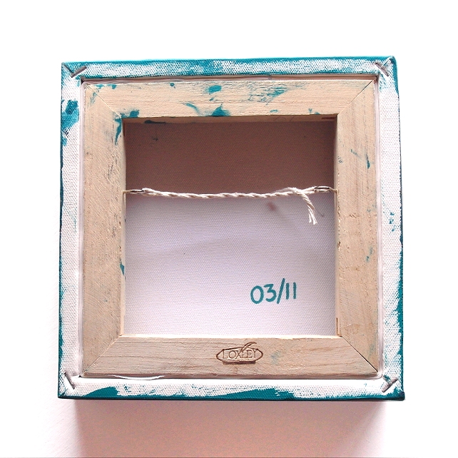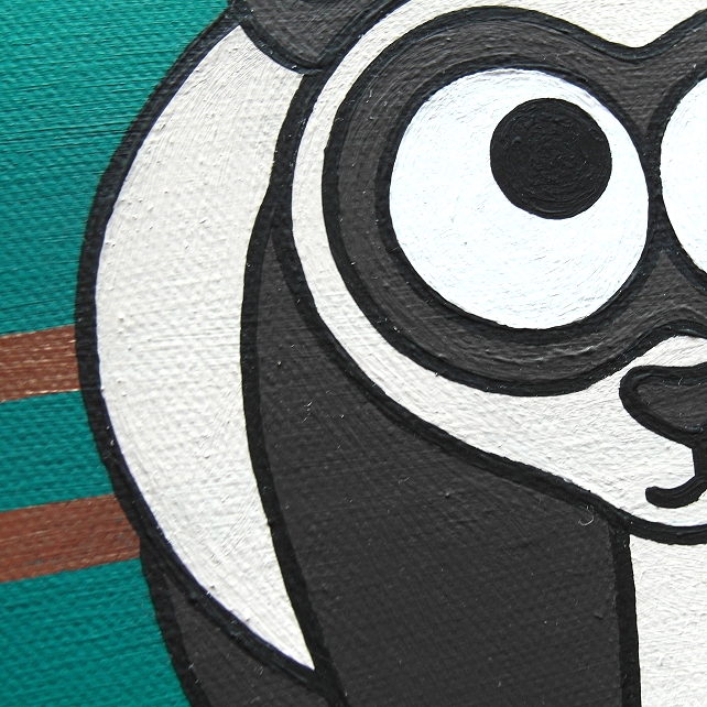 The cartoon panda is painted in acrylics (with enamel for the gold), on a 20cm square canvas with 3.8cm deep edges (7.9" square with 1.5" edges) The stripes carry on over the edges of the canvas so there is no need for framing