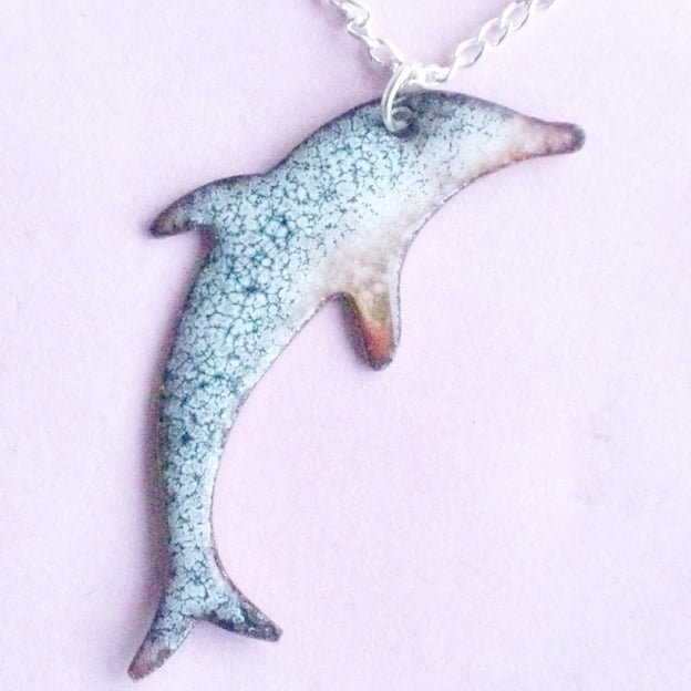 The dolphin measures 42mm, nose ro tail. It is mounted on a 45cm silver plate curb chain that fastens with a simple bolt ring.