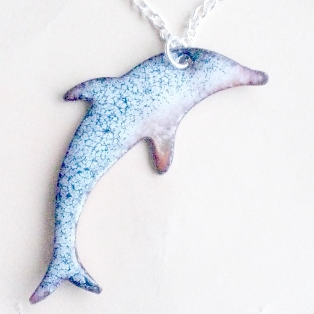 To make it, I first laid in coats of clear enamel over the copper base; this gives the golden brown colour of the dolphin's belly and lower fin and also allows the golden brown to show through the other coats depending on the direction and intensith of the light on the dolphin when it is worn, so creating a shimmer in the effect of the pendant. I then laid over this a coat of white, avoiding as best I could the belly and lower fin. Over that coat I laid in a coat of dark blue to get the mottled effect on the dolphin's back, tail and upper fin.