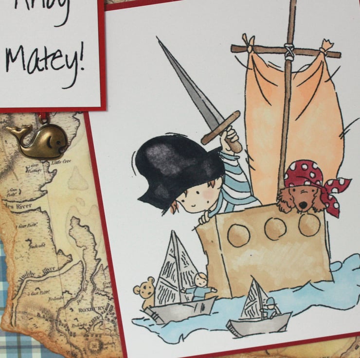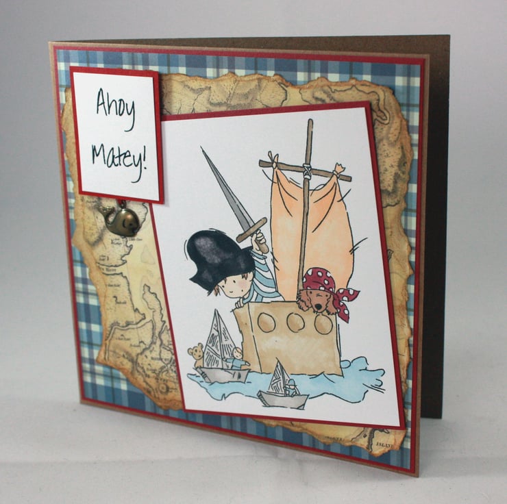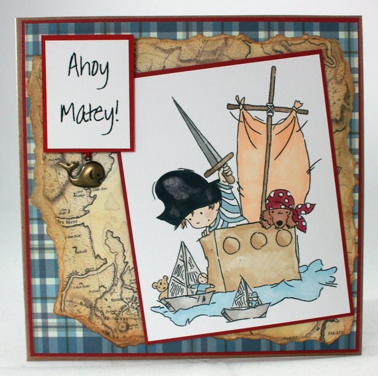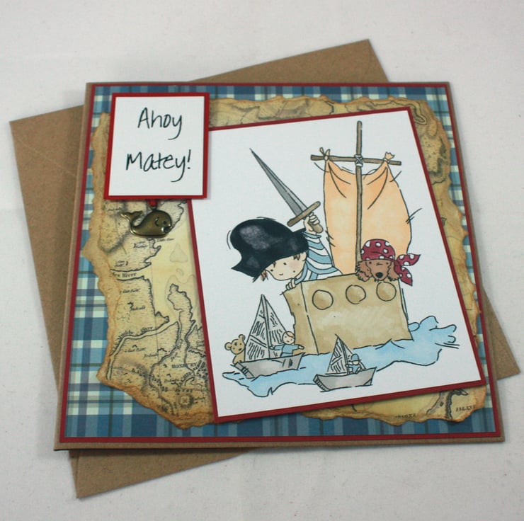 The card features a cute image of a child and dog playing at being pirates. The image has been layered over a distressed treasure map and blue checked background paper. The card is finished with the printed message 'Ahoy Matey!' and a small metal whale.