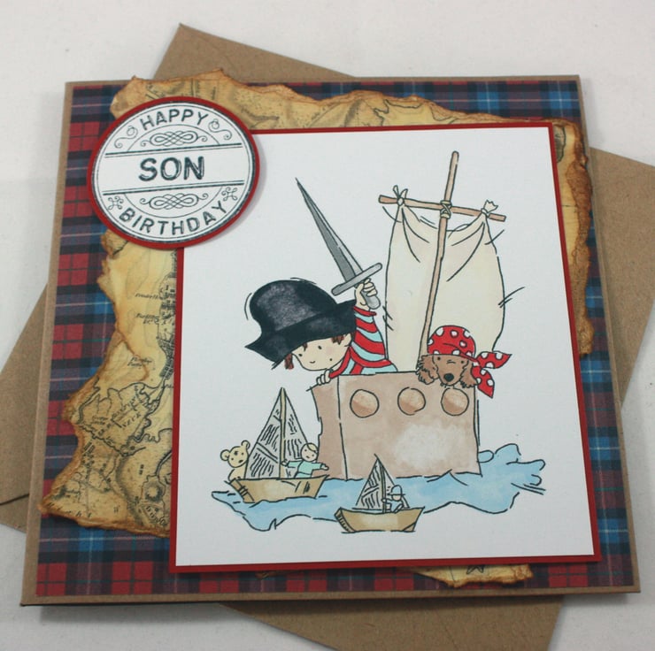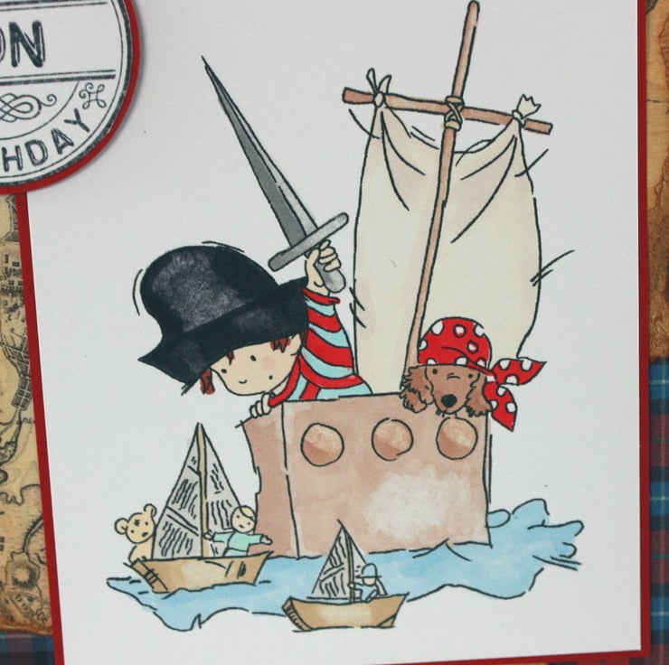 Handmade birthday card featuring a cute image of a boy with his dog playing at being pirates. The image has been coloured using Promarkers and layered over a treasure map and tartan background paper.