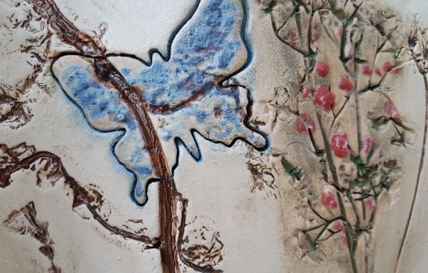 Approx 30cm wide, this curved panel is decorated with impressed shells, and glazed in a beautiful sea blue.