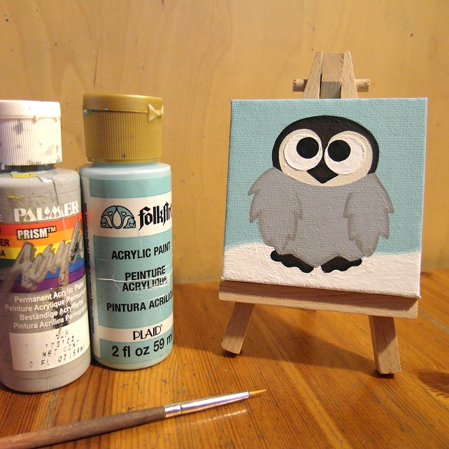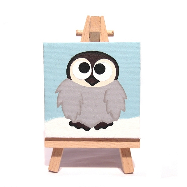 This penguin is painted in acrylics on a 7cm (2.8") square canvas and comes with a 12cm (4.7") high wooden easel for display.