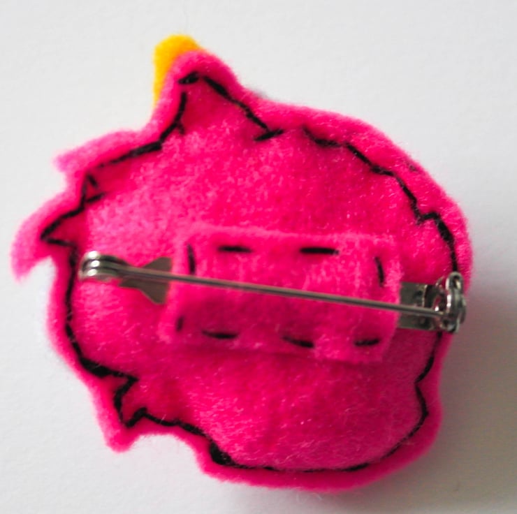 Hand cut, hand sewn using felt materials, with cotton thread and stuffed using polyester stuffing. On the back is attached a sliver colored brooch pin.