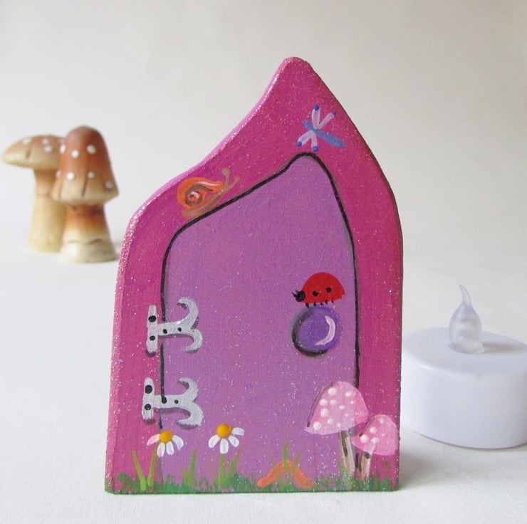 The Door is hand cut from mdf and handpainted with toadstools and little insects.