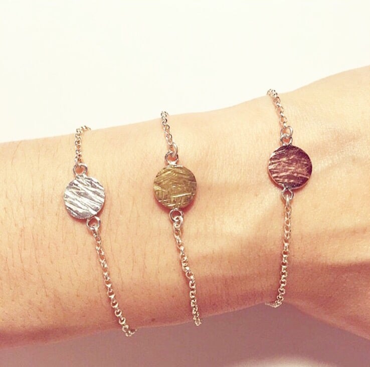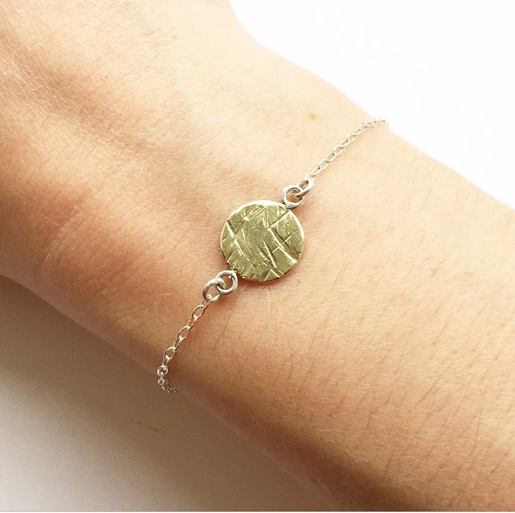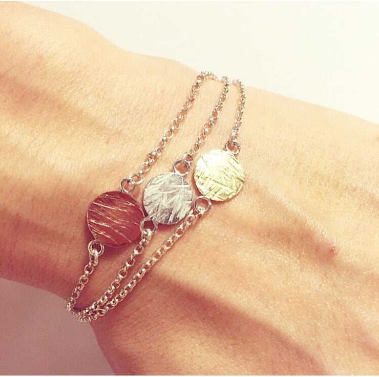A B O U T : A sterling silver chain bracelet with hammered brass disc.