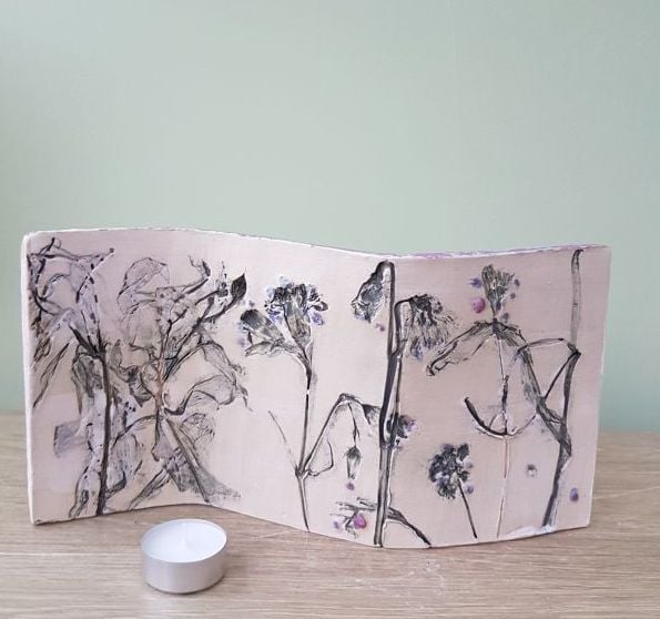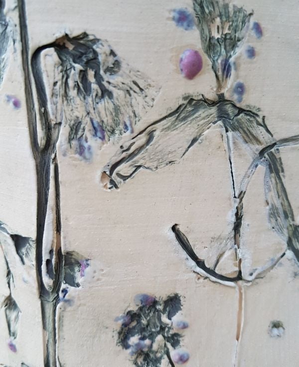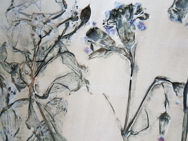 Approx 30cm wide, this curved panel is decorated with impressed real flowers, and glazed in a beautiful grey with hints of ‘tutti frutti purple’.