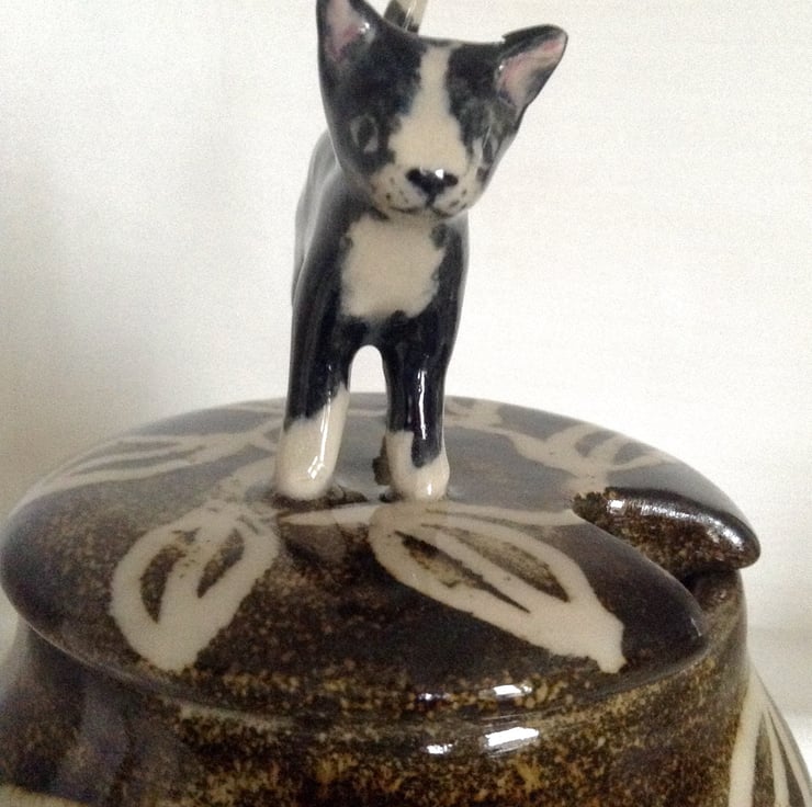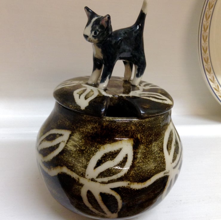 Sugar or jam pot, hand thrown on the wheel, with a brown leaf design and an adorable hand sculpted black and white kitten on the lid. The lid has a space to fit a jam or sugar spoon.The pot measures approx 10.5 cms across and 15 cms high.