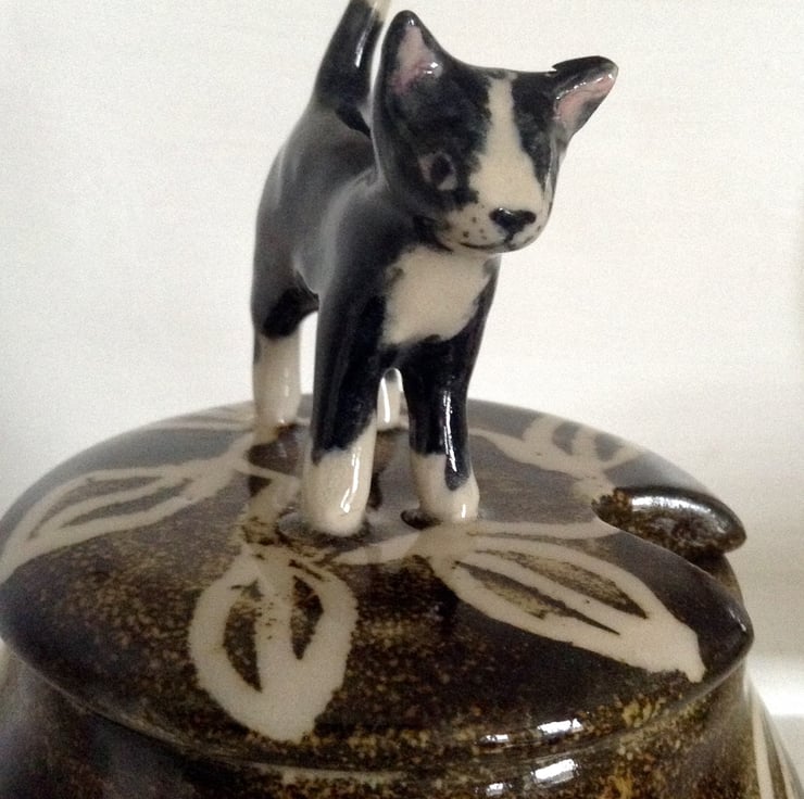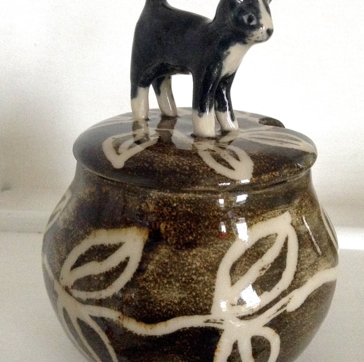 This pot is decorated with a leaf design in iron oxide, using the wax resist method. This is where liquid wax is applied to the areas of a pot where no colour is wanted. Colour is then applied to the whole pot and when fired the wax burns away leaving the design exposed. It's one of my favourite forms of decoration as you get a soft effect design rather than a hard edge. The little kitten on the lid makes the whole pot a unique and charming gift.