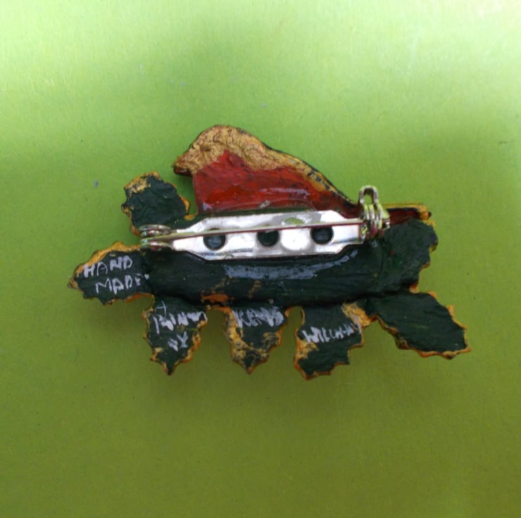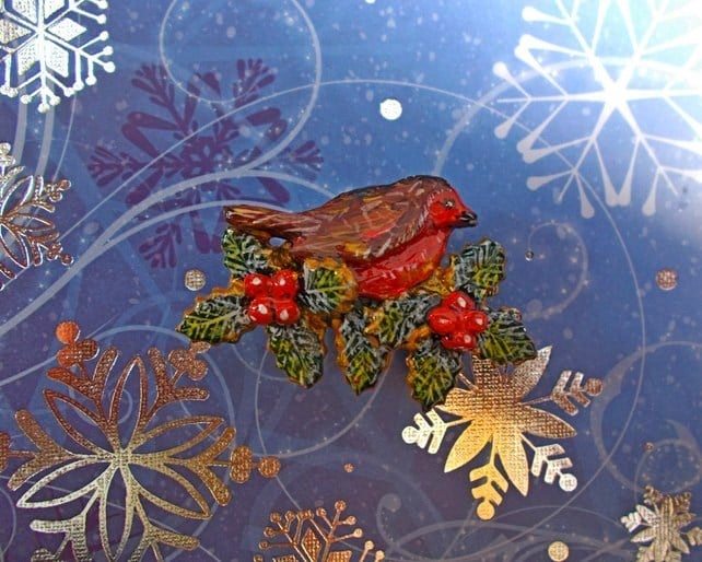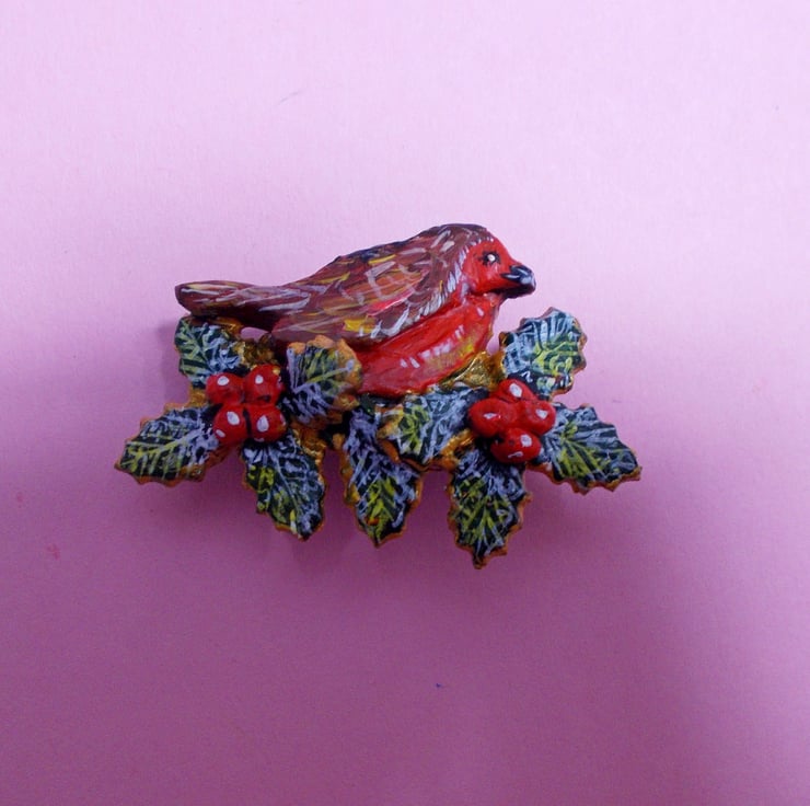CHRISTMAS ROBIN & HOLLY BROOCH : Handmade Clay Festive Lapel Pin, Hand Painted