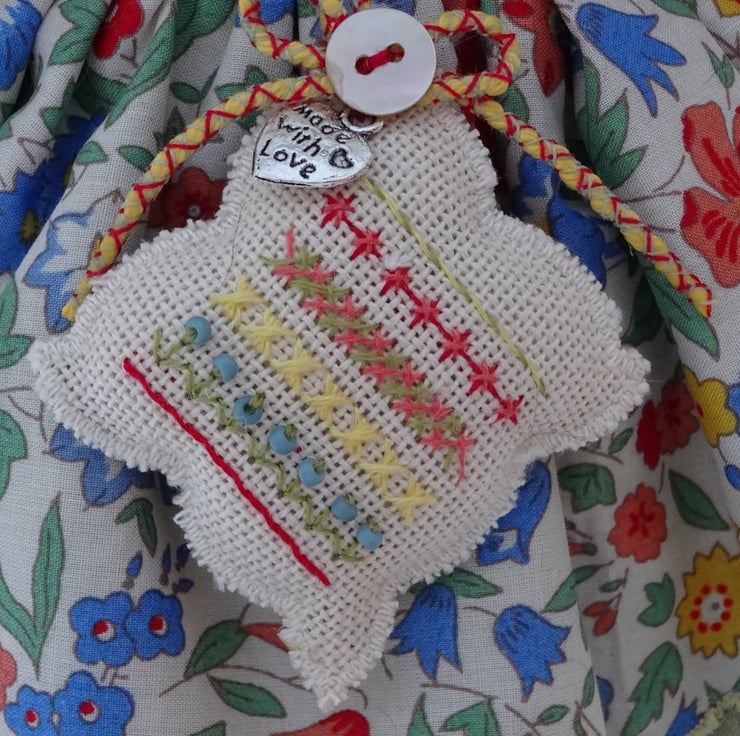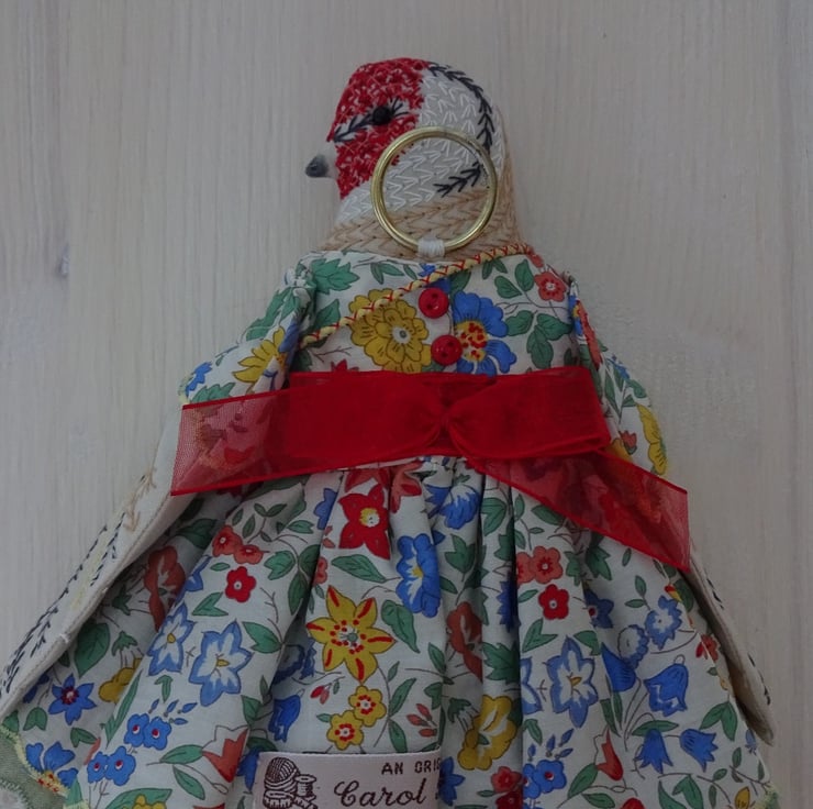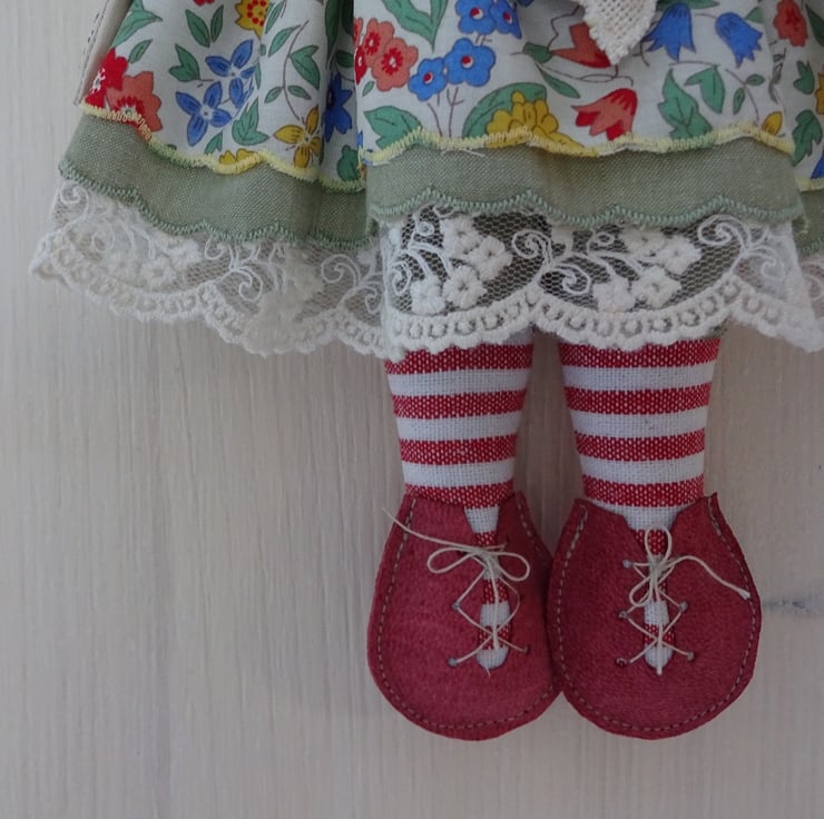 This is Kate, she is a hand embroidered goldfinch rag doll. I use no paint to delineate the pattern but work freehand embroidery onto self colour cloth to make the plumage both on the front and the back of the doll. Kate is dressed in a pretty floral patterned cotton lawn from Liberty with coordinating underskirt and a final lace underskirt to finish. She has stripy legs and little leather shoes. Her dress is finished with buttons and ribbon and she carries a little lavender sachet that is also embroidered. She has a little brass ring to her back so she can hang.
