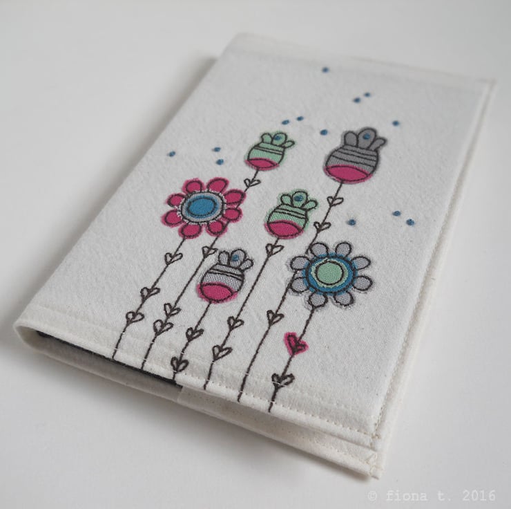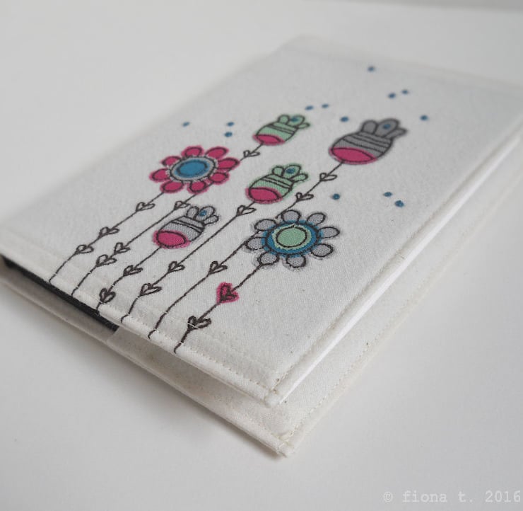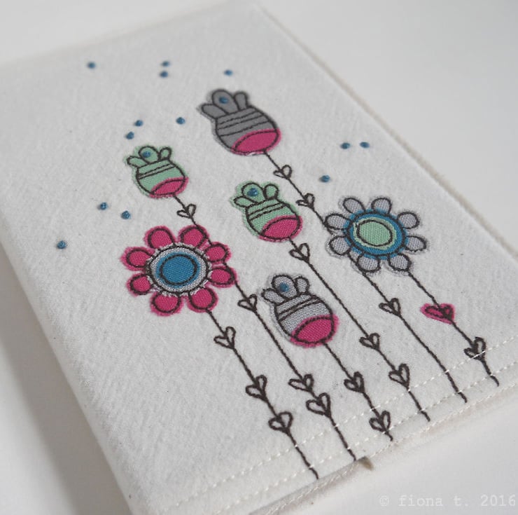 embroidered fabric notebook cover with stylised florals in cotton & linen fabrics – pink, green, grey, turquoise.