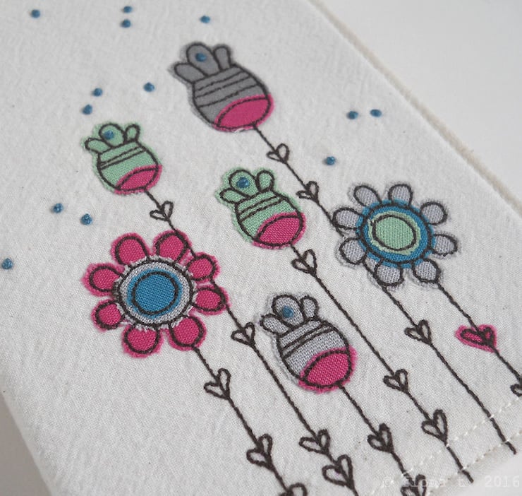these bright and cheerful stylised flowers are cut by hand from cottons & linens, then layered and then appliqued onto prewashed cotton calico. the detail is stitched freehand using the free motion embroidery technique, and the design is further embellished with hand embroidered french knots.