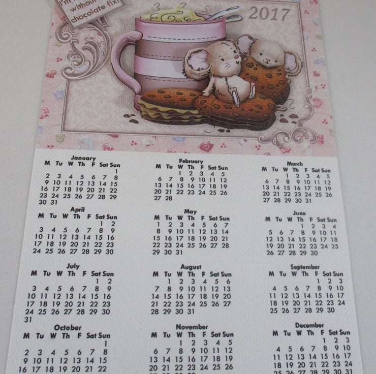 This pretty calendar measures approximately185x260mm(7x10in) . It is decoupage/ 3D and there is a hanger.