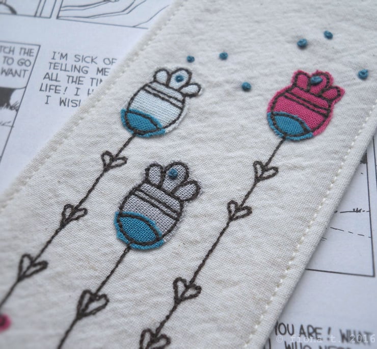 freehand embroidered floral fabric bookmark – pink & turquoise.