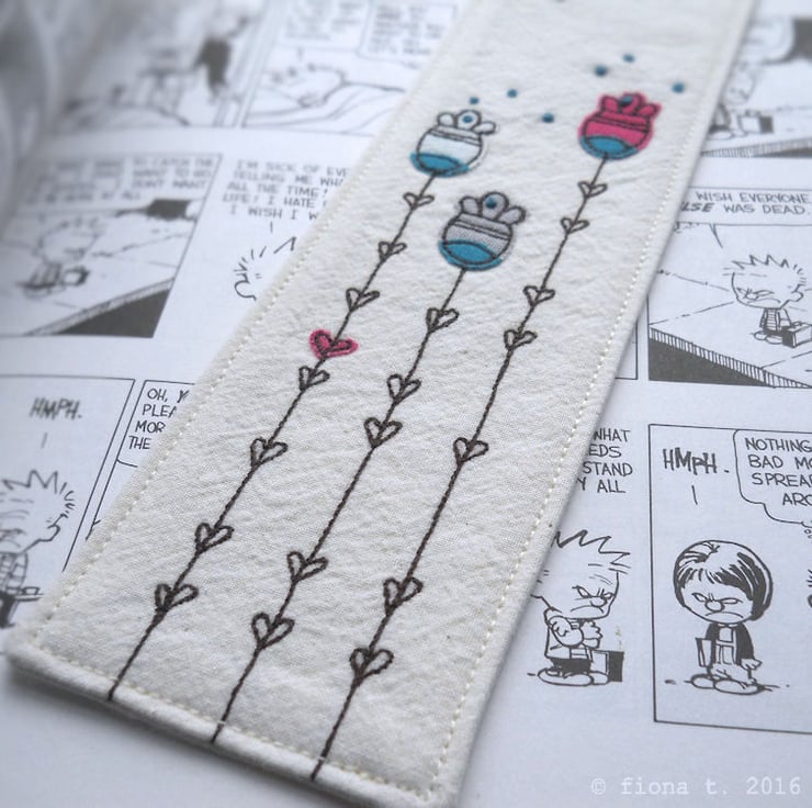 this bookmark is made entirely on a domestic sewing machine – no computerised malarkey - everything is cut, stitched and handmade, with care, by me, ensuring each item is unique, well made and securely constructed.
