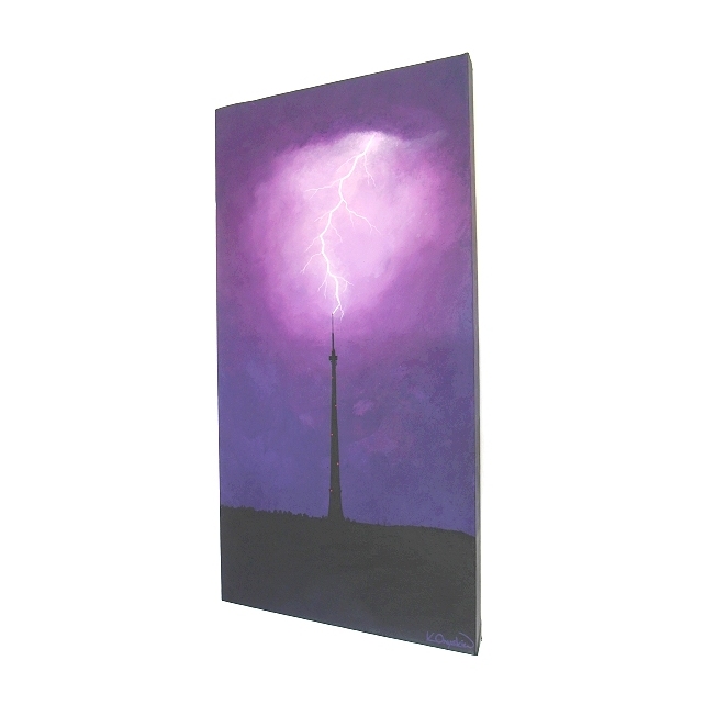 Emley Moor Tower, a Yorkshire landmark, is silhouetted against a stormy dark purple sky, with a bright flash above as the tower gets struck by a fork of lightning.