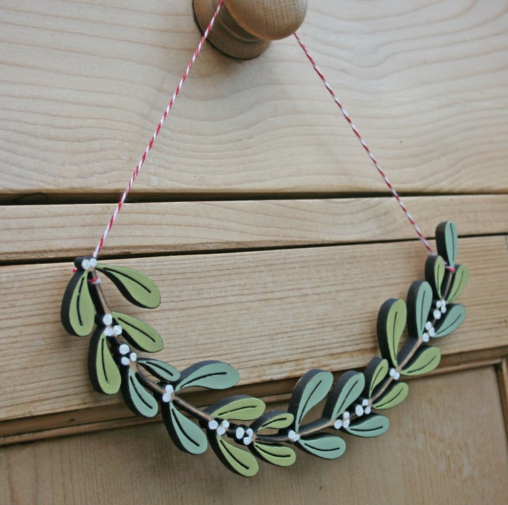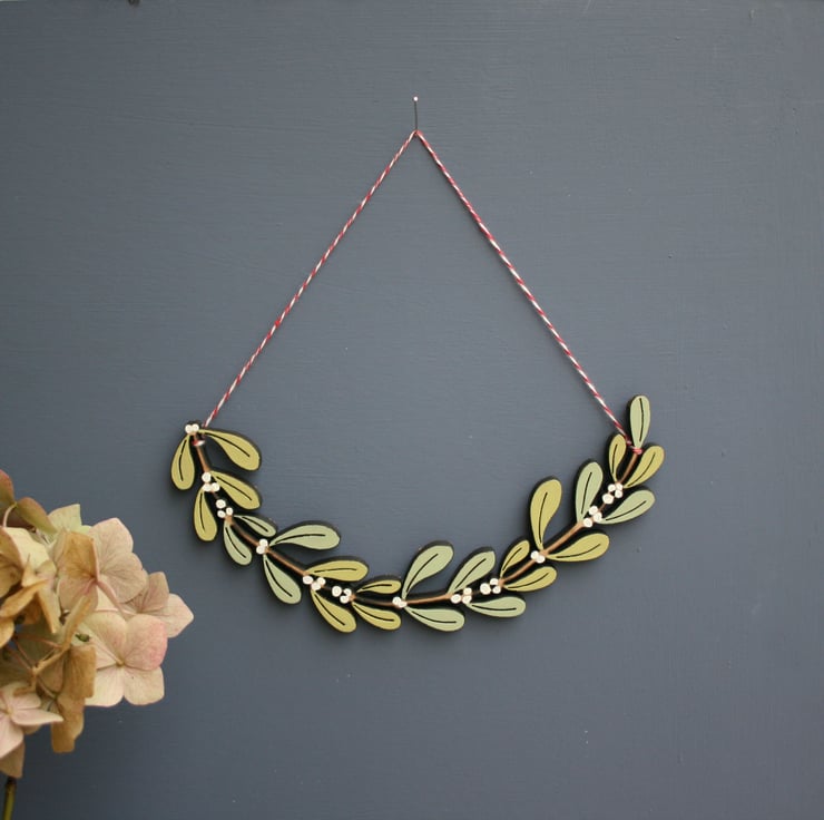 This is designed, laser cut and handprinted by me in studio. I take inspiration from the British countryside and have loved studying the Mistletoe foliage.