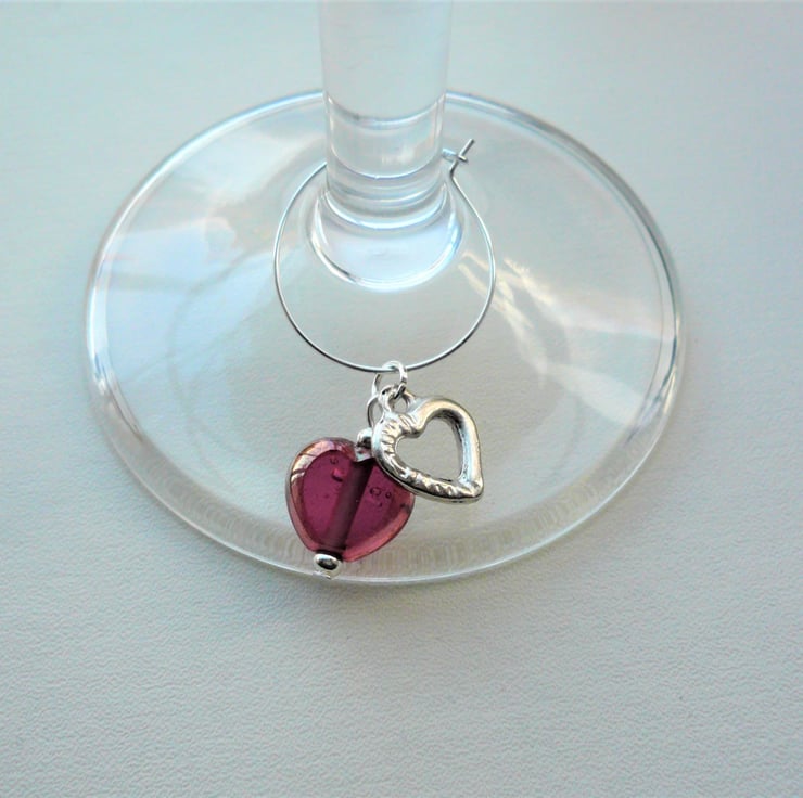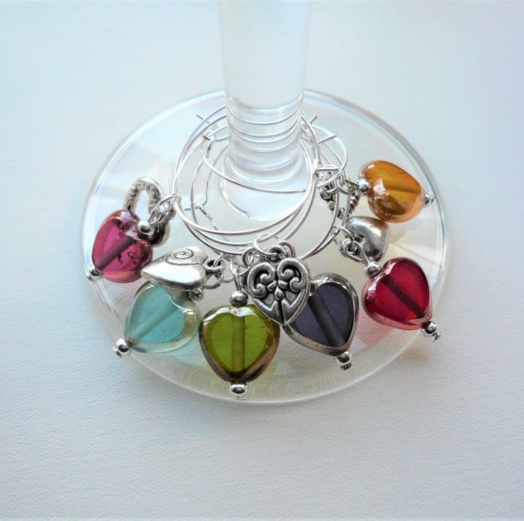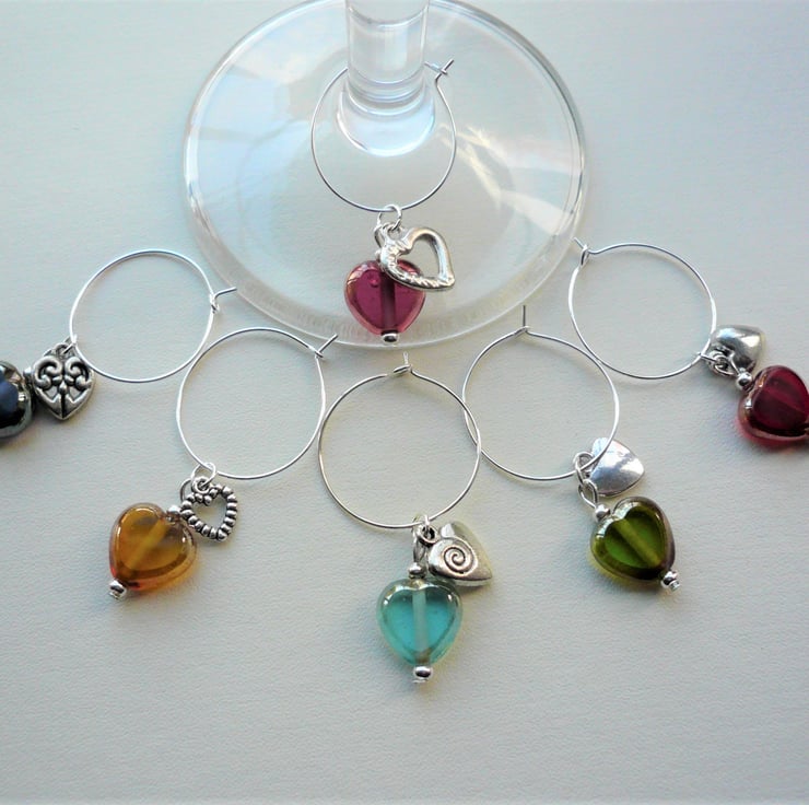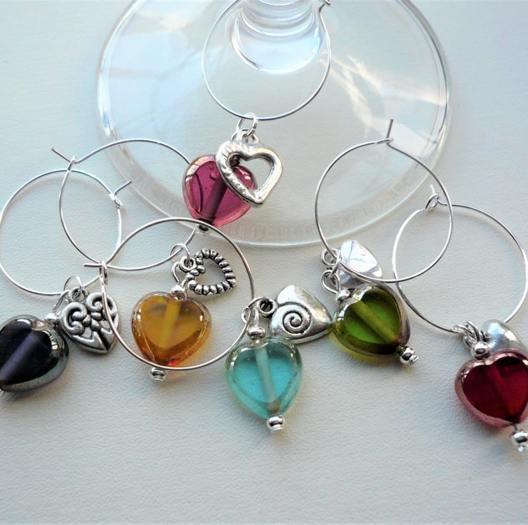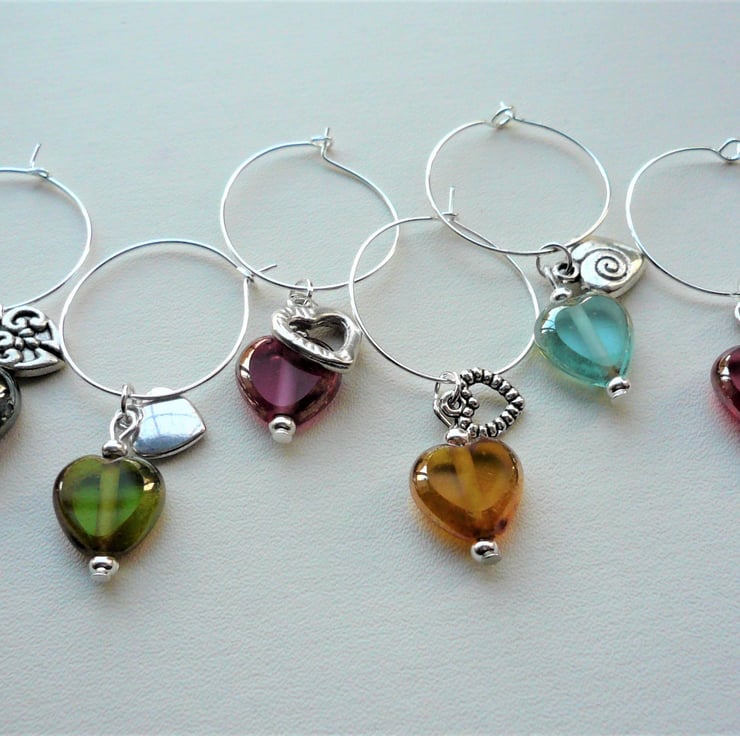 This pretty set of 6 wine glass charms is made up of 10mm different coloured glass lustre heart beads teamed with all different styles of Tibetan silver heart charms. All attached to 25mm silver plated rings.