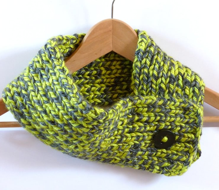 A chunky hand knitted neckwarmer in a lovely soft bright green and charcoal grey yarn. The neckwarmer is trimmed with a large olive green button which is stitched through both layers of the headwarmer (no buttonhole). So just pull it over your head. This item would brighten a plain jumper as a knitted collar or would be lovely and snuggly under your coat. The neckwarmer will be sent by Royal mail packed to arrive safely.