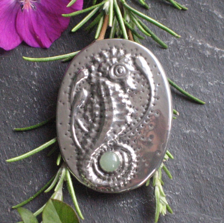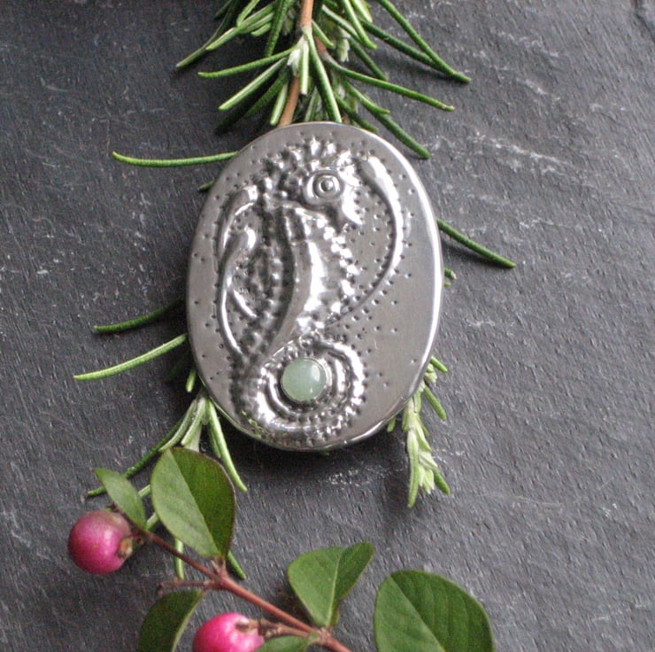 Pewter seahorse brooch, shiny silver with green aventurine stone. Depicted on this handmade brooch is a seahors with its tail wound around a pale green aventurine gemstone. The brooch measures 45 x 34mm and will be sent in a gift box. A brooch will add interest to the plainest of outfits and my unique handcrafted brooches will co-ordinate with any colours or patterns. My pewter jewellery is light in weight so you can wear it on most types of fabrics.