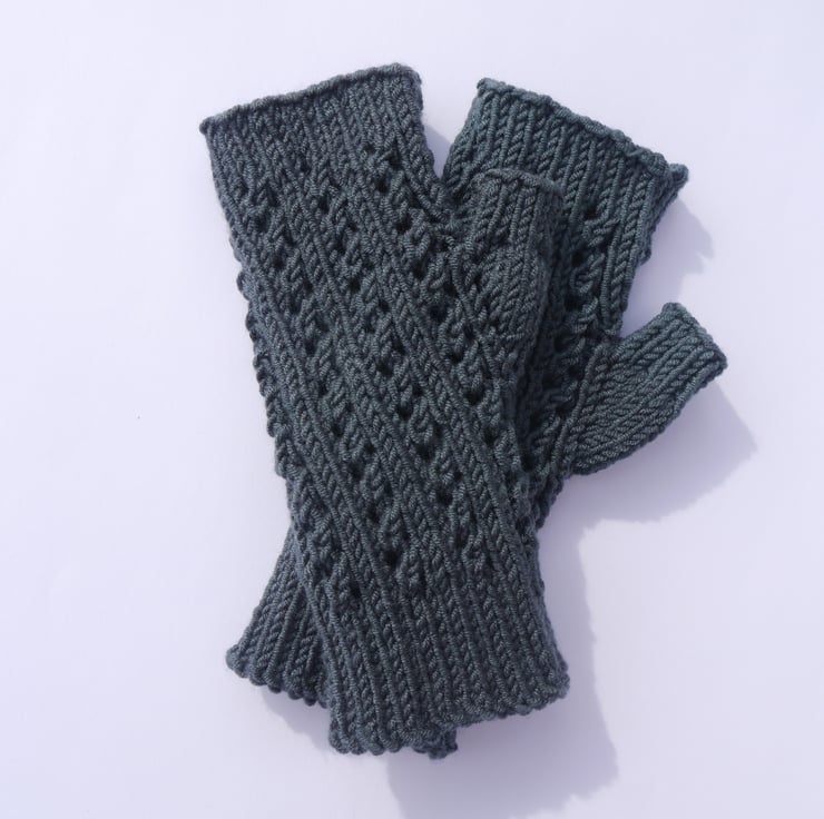 These warm and cosy fingerless mittens have been hand knitted by me using a lovely soft acrylic wool. They have a lacy ribbed pattern which gives the perfect fit. I have knitted these mittens in the round using four needles so there are no seams. They are a ladies size and measure appox 21cm long.
