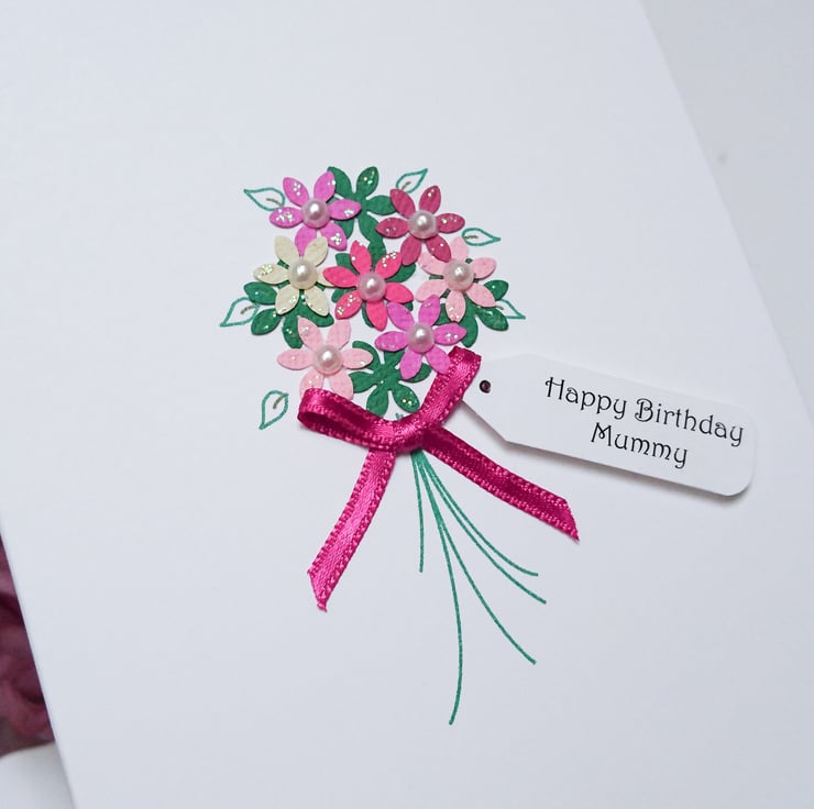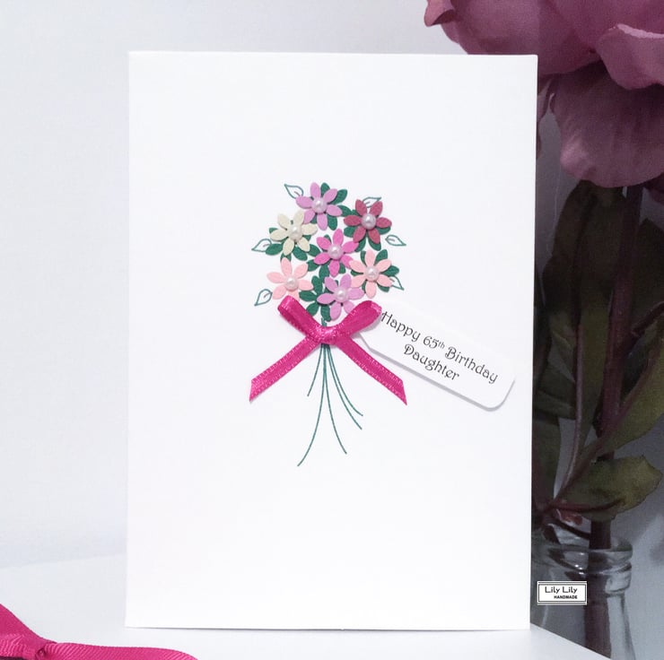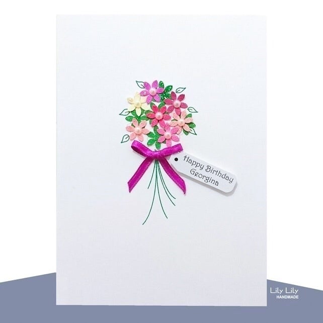 A pretty birthday card featuring a floral bouquet design by Lily Lily Handmade. The bouquet, made up of pretty co-ordinated multi-coloured pink, purple, red and cream flowers is beautifully tied with a pinky purple satin ribbon. Colours with the bouquet may vary very slightly from that seen in the photos but will be just as lovely. The bouquet is accompanied by a personalised gift tag with your own message. The flowers are embellished with pearls and a touch of glitter.
