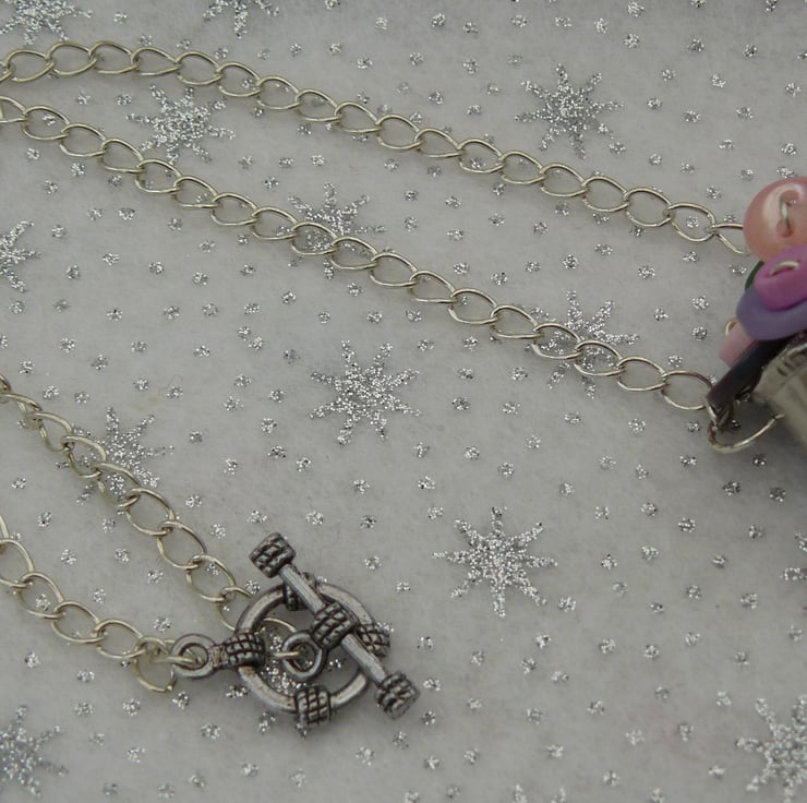 The bucket of flowers stands approx 3cm tall and is presented on a chain approx 40cm in length with a t-bar clasp.