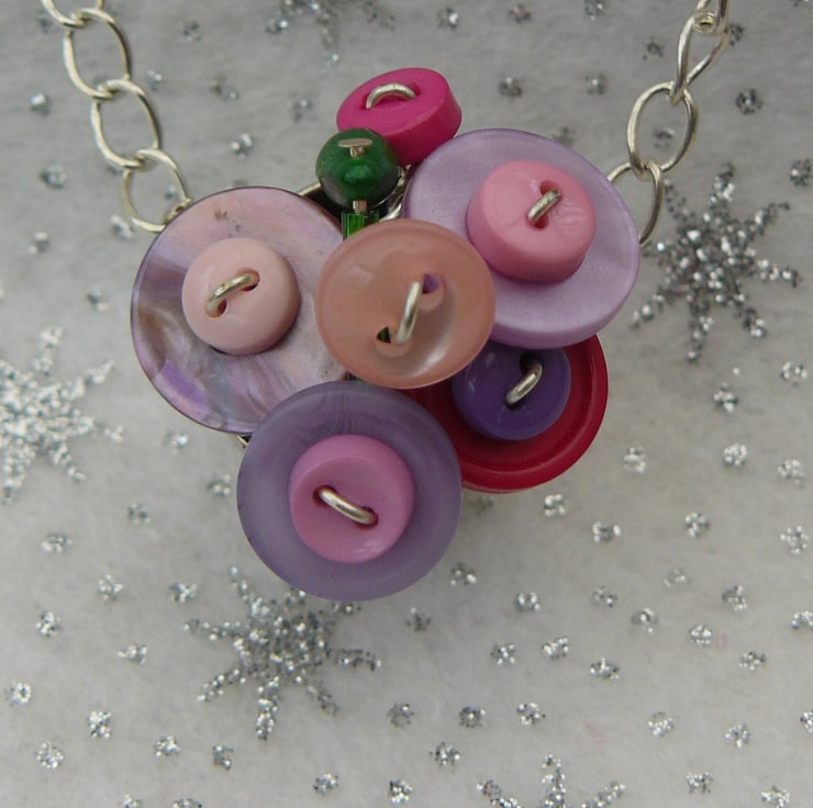 A miniature wired bouquet made from teeny tiny pink and purple buttons and green beads makes up this mini bouquet, presented in a thimble bucket.
