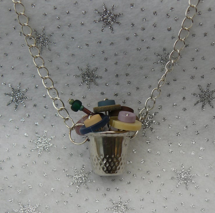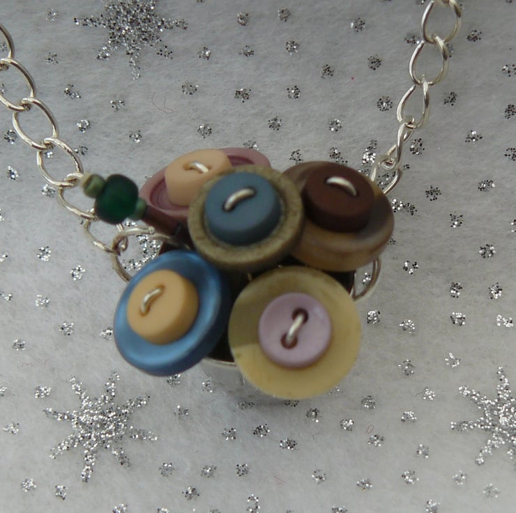 A miniature wired bouquet made from teeny tiny buttons in vintage shades of cream, beige, antique mauve and airforce blue, with a spray of green and brown beads green beads makes up this mini bouquet, presented in a thimble bucket.