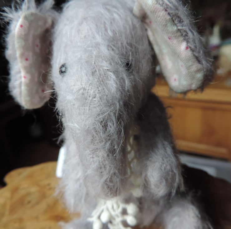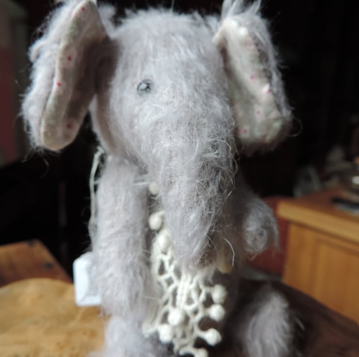 Cute little fully jointed mohair elephant. Approx 4 inches tall when seated. Hand sewn , with glass eyes and cotterpin joints. In a lovely soft lavender mohair.
