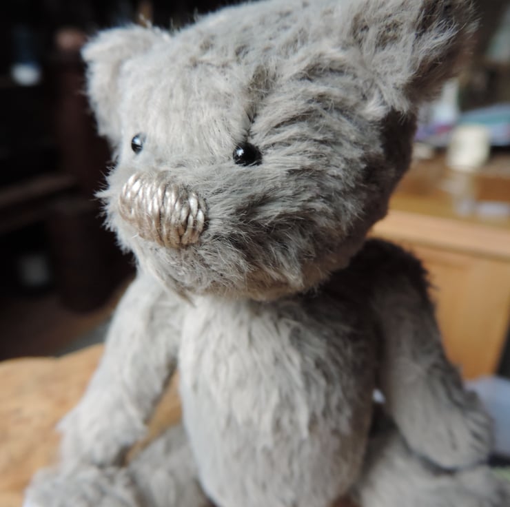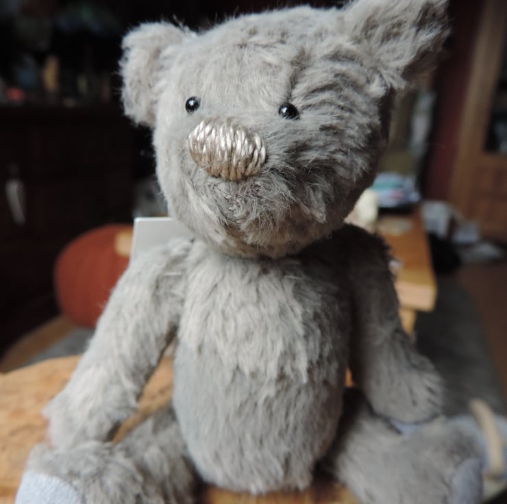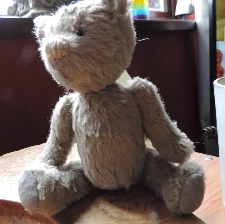Cute little 5 1/2 inch viscose bear. Fully jointed, hand sewn bear. Made from a soft grey viscose, with glass eyes and cotterpin joints.