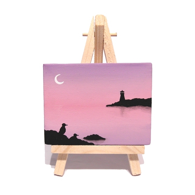 The seascape is painted in acrylics on a 7cm x 9cm (2.8" x 3.5") mini canvas and comes with a 14cm (5.5") wooden easel to display the painting on. The canvas is signed and dated on the back.