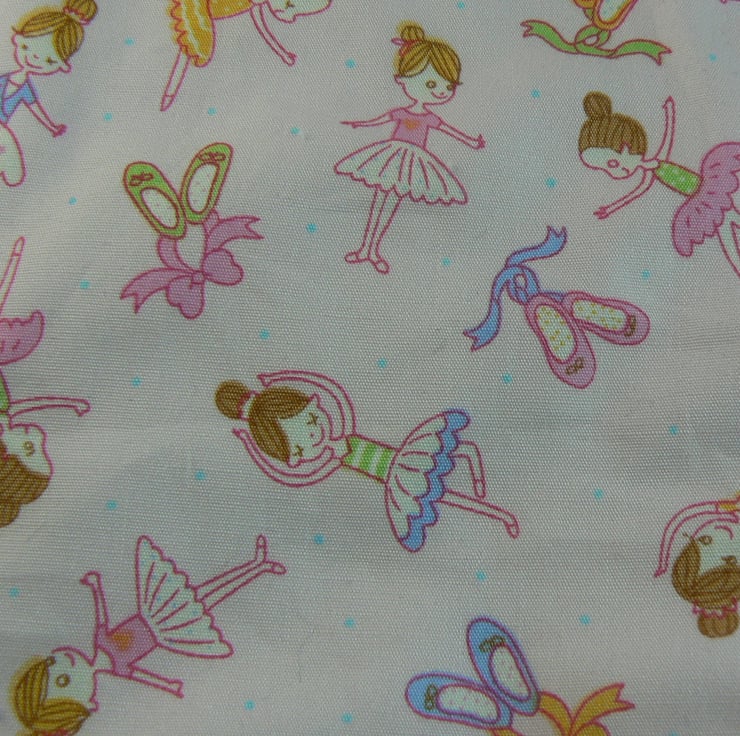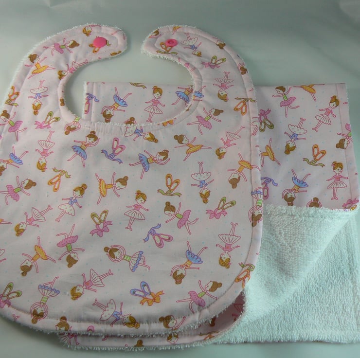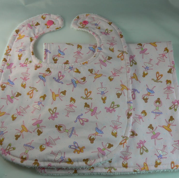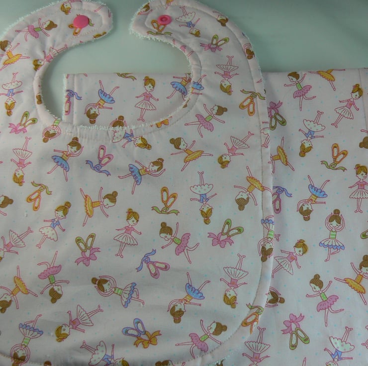 I have made this bib and birp cloth from 100% cotton fabric. The fabric has cute little ballerinas dancing all over it. The backing is Terry toweling and the bib is fastened with a plastic popper.