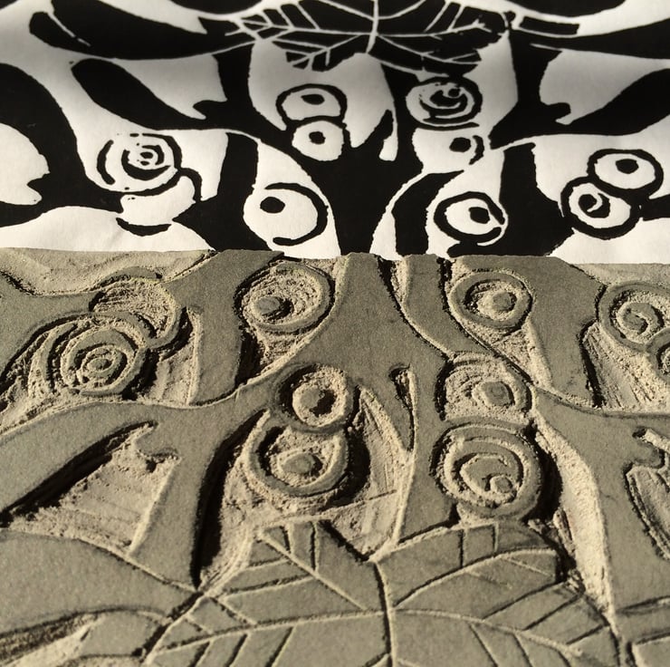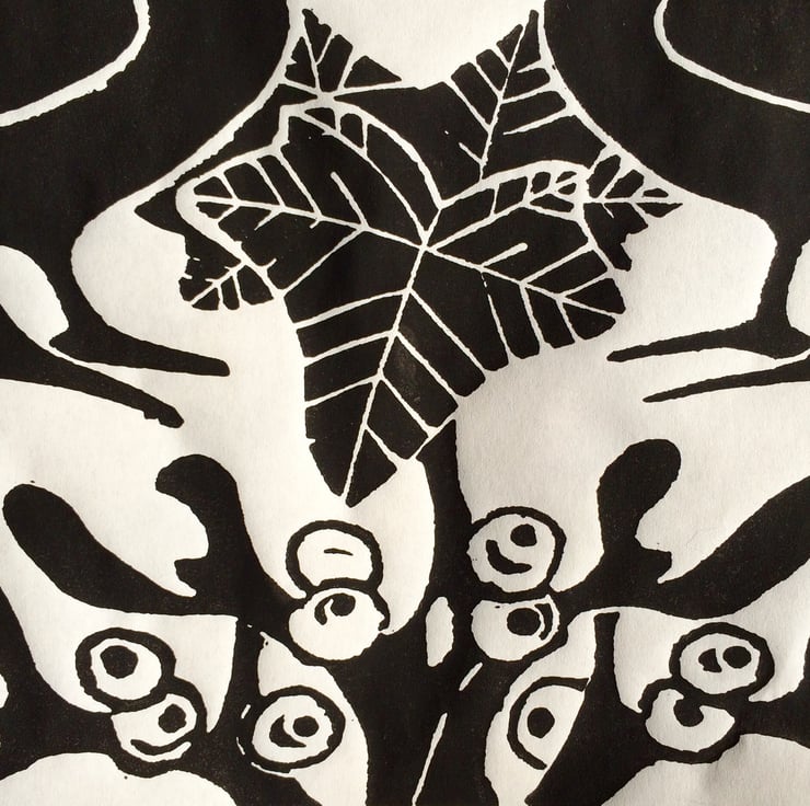 This linocut is also available in red, and the design is available as Christmas cards in red, green and black.