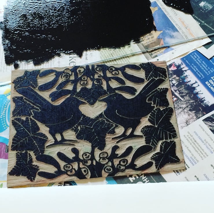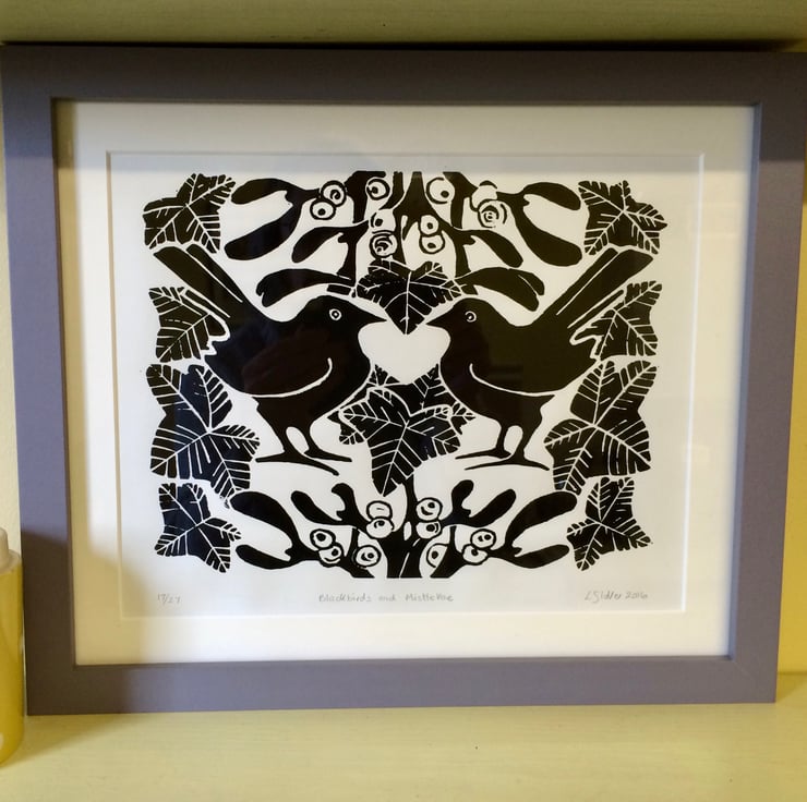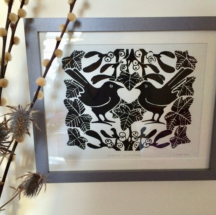One of 27 limited edition hand pressed lino print of blackbirds and mistletoe.